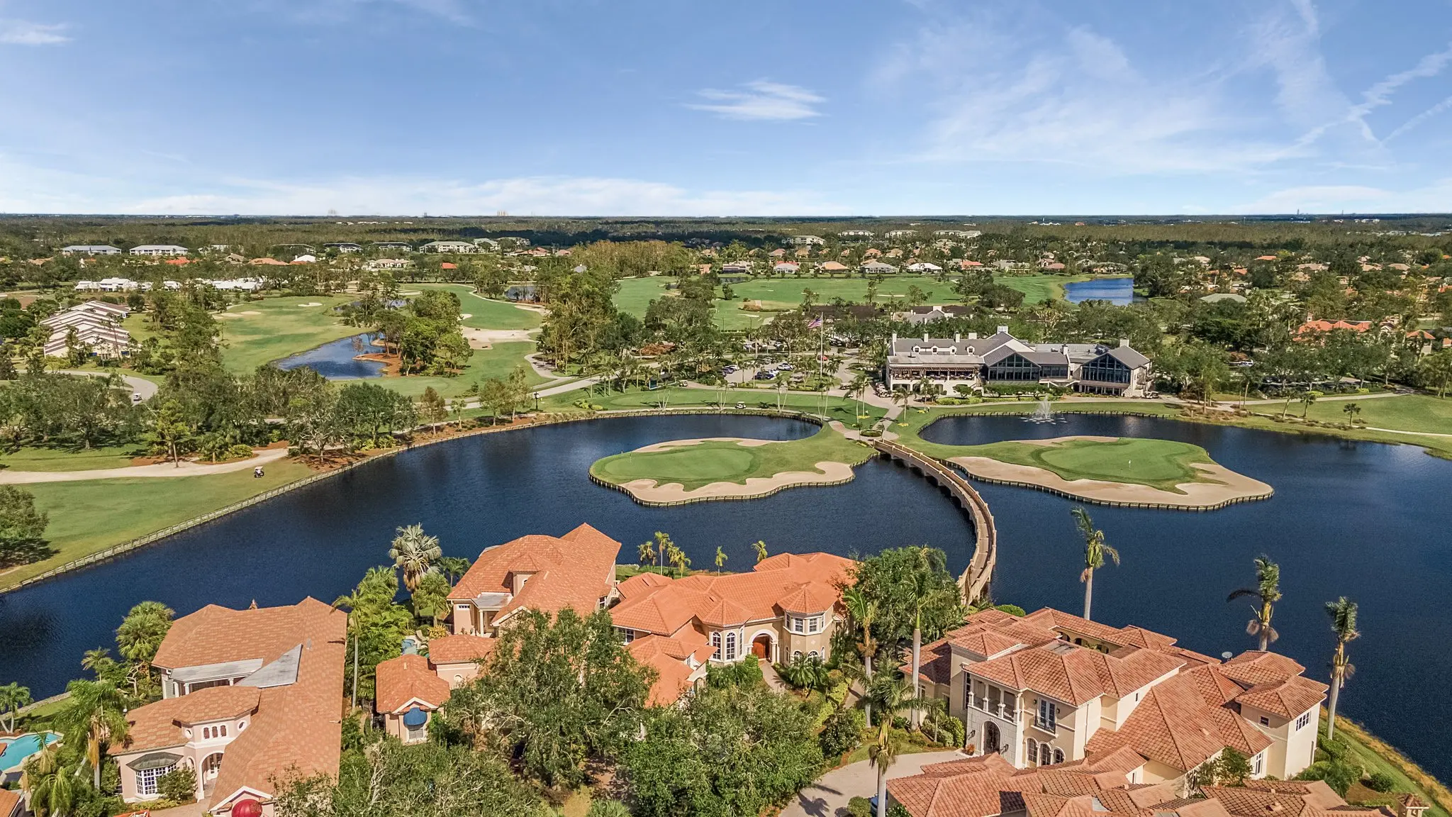 St Andrews is one of Fiddlesticks’ signature neighborhoods — 25 exquisite Mediterranean-inspired single-family homes with a cohesive architectural style defined by stucco facades, terracotta roofs, and arched entryways. Set on generous lots with mature oak canopies and lush landscaping, these homes offer sweeping lake-to-golf-course views along the 8th, 9th, 17th, and 18th holes of the Long Mean. Soaring ceilings, gourmet kitchens, and en-suite bedrooms are standard — many homes feature private pools, outdoor kitchens, his-and-hers master baths, wine rooms, and custom architectural details throughout. The zero-lot-line HOA handles exterior landscaping, and a dedicated golf cart and walking bridge connects St Andrews directly to the clubhouse.
